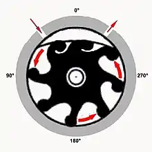 It consists of a cylindrical compartment with a false deflector that turns it into an oval. Inside the cylinder rotates an impeller with radial neoprene blades, whose turning movement ensures the formation of variable volume chambers with the compartment wall. Since the impeller is in a non-central position, the formation of chambers (delimited by the impeller blades) of variable volume occurs, between which the fluid passes, which the blades suck from the inlet hole and push towards the hole. exit.[2]