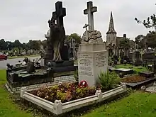 Jack Cornwell was initially buried in a common grave (Square 126 Grave 323) in Manor Park Cemetery, London, although his body was exhumed on 29 July 1916 at which he was reburied with full military honours in the same cemetery (square 55 grave 13).[2] Cornwell's father Eli, who died on 25 October 1916 from bronchitis during home service with the Royal Defence Corps, was buried in the same grave on 31 October 1916.[3] The epitaph to Jack Cornwell on his grave monument reads,