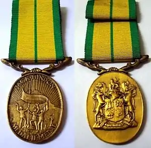 The Jack Hindon Medal, post-nominal letters JHM, is a South African military decoration which was instituted in the Republic of South Africa in 1970 and which was only in use until 1975. It was awarded to other ranks for diligent service in the Commandos, the rural defence component of the South African Defence Force.[1][2][3]