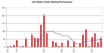 Ryder's long district cricket career for which he is best known spanned 37 years, from 1906–07 until 1942–43. His career of 338 games was played almost entirely for Collingwood, except for six games for Northcote in 1933–34 and 12 games for the VCA Colts in 1939–40. He scored 12,677 runs at 41.83 with 37 centuries, and took 612 wickets at 16.83 with 46 five-wicket hauls.[2] The medal for the outstanding player of the season in Melbourne Premier Cricket is named in his honour, and was first presented in 1973–74.