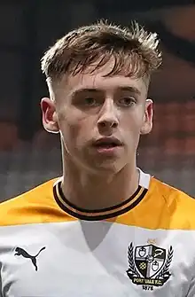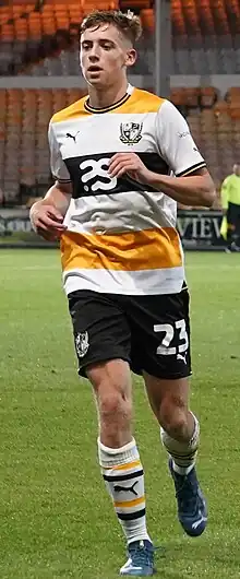He featured in cup games early in the 2023–24 season, playing at wing-back and on the left of a back three.[7] On 19 December, he joined Northern Premier League Premier Division club Stafford Rangers on a one-month work experience loan.[8] He was recalled to Vale in time to play in the 3–2 defeat to Barnsley on Boxing Day, scoring a late consolation to make him the youngest goalscorer in the club's history at 16 years and 242 days.[9] [10] He made his league start on 29 December, in a 3–0 win over Blackpool at Vale Park, when he received praise for keeping opposition winger CJ Hamilton quiet.[10]