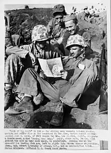 During his service on Iwo Jima, Smith was the subject of an Associated Press photograph that appeared on the front page of hundreds of newspapers across the United States. On D-Day plus 5, he had received a care package from his wife, who was pregnant with their first child. The package contained a book titled Naming Your Baby along with a letter encouraging him to help decide on a name while there was still time. As Smith flipped through the pages, a crowd of Marines formed around him, each of them urging him to look up their own names, and the names of their fathers, mothers, siblings, and girlfriends. "While we were engaged in this incongruous diversion," Smith wrote in his February 21, 1979 column, "a photographer happened by and was curious. What was going on here? He was sick of death, shock and horror and was looking for something upbeat. Human interest. A sign that life would go on." The photographer snapped several photos, one of which was distributed by the Associated Press and appeared in newspapers a few days later.[7]