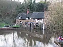 Jackfield grew as a river port for nearby Broseley and Benthall (which are situated high above the Severn) and is a notable part of the area's famous early industrial activity. The first railway in Shropshire and second in Great Britain was built here – by 1605, the lord of the manor of Broseley, James Clifford, had constructed a wooden railway (usually termed a wagonway) from his coal mines to the river at Jackfield. It has recently been suggested that this is older than the Wollaton Wagonway which is generally thought to be the earliest such wagonway.[1][2] There was a pottery here from at least 1634 and corn mills existed along the stream that flowed into the river. The wooden railway also followed the route of this stream, which is the valley which Calcutts Road runs down.