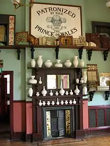 The potteries flourished and became known for their drinking mugs produced, and the Thursfield family from Stoke-on-Trent ("the Potteries") arrived in 1713 to set up a pottery here. Their Jackfield Ware (a highly vitrified black earthenware decorated with gold flowers and figures) became famous around the mid-18th century.[3] Manufacture of pottery continued throughout the 19th and 20th centuries, with specialism moving on to the production of tiles, including high quality encaustic tiles, and this manufacture continues today albeit on a small scale (in part to replace Jackfield-made tiles in conservation work, including on the London Underground and the Houses of Parliament). Jackfield Tile Museum is one of the ten museums of the Ironbridge Gorge Museum Trust.