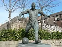 Three statues of Milburn were commissioned. One was placed in Station Road in his birthplace Ashington. The funds were raised by the Civic Head, Cllr. Michael George Ferrigon during his term of Office. It now stands at Ashington Leisure Centre in Lintonville Terrace. A second statue of Milburn was unveiled by Laura Milburn on Newcastle's Northumberland Street in 1991. It was designed by sculptor Susanna Robinson and cost £35,000. The fee was raised after an appeal by the local newspaper attracted donations from local businesses and Newcastle United supporters.[136][137] The statue stands 12 feet (3.7 m) high and the inscription reads: John Edward Thompson Milburn, footballer and gentleman.[138] It was relocated in 1999 to St James' Boulevard, and then moved again to its present position on Strawberry Place, just outside St James' Park.[10]