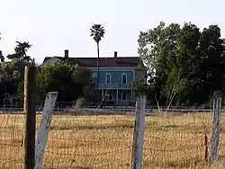 The house is built of redwood timber on a brick foundation in a primarily Italianate style;[2] it has two stories and twenty rooms,[3] It was designed by Nathaniel Dudley Goodell of Sacramento[4] and built on farmed land; the brick smokehouse and the three-story water tank house, attached to the house in the late 19th century, date to the period of its construction, with the iron doors to the smokehouse reportedly having originally belonged to the Maine Prairie Rifles militia armory, which was built in about 1863.[2] The plan of the house resembles a "Z", with wings at the northeast and southwest corners. The siding is also redwood, with pilaster corners and triangular pedimented gables constituting elements of Greek Revival style. A porch with Tuscan-style columns wraps around the south and east sides of the house, and there is a balustraded balcony on the second floor. The gable ends have fishtail shingles, and the cornice is ornamented with carved brackets with finials. Carved crowns appear above both the windows and the ventilators in the gable ends.[2]