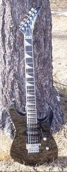 The SL2 is again a USA made Soloist with neck-thru construction (all Soloists have neck-thru constructions). The SL2 can be considered a more modest version of the SL2H, made up of maple thru-body neck and poplar wings, with an ebony board and "optional" sharktooth inlays. Most of them had a plain fingerboard without inlaid markers on it. The bridge is Jackson's Floyd Rose-licensed double locking tremolo JT-580 which is widely used on Japanese-made Jacksons. The Jackson logo is not "mother of pearl" on SL2s while it is on SL2Hs.