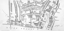 At the time of the 1920s news reports, the site of the house, which had been in Metcalf Court as shown in a reproduction of the 1855 plan,[15] was behind 18 Eckell Street (formerly Edwards Street),[15] and "occupied as stables by Messers. R. Chartors and Co.".[14] But "in the time of a Dickens" it overlooked the Folly Ditch on one side and was approached by means of "two wooden bridges across the mill stream',[14] and was "used by thieves of the area".[15]