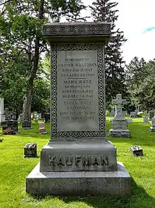 Kaufman died on April 20, 1920, at home in Kitchener.[2] His estate was valued at $278,879, $50,000 of which was designated for distribution to charitable, religious or educational endeavours at the discretion of his wife and children, who acted as executors.[8] He was remembered by Chronicle Telegraph as a "town builder" for his role and influence in the development of various local industries.[9] He was buried at Mount Hope Cemetery in the Kaufman family plot.[10][2]