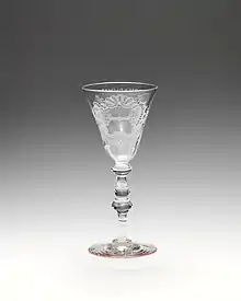 Jacob Sang, also known as Simon Jacob Sang, (c. 1720-1786) was an 18th-century Dutch glass engraver. Active in Amsterdam from 1752 to 1762,[1] he engraved wine glasses, goblets and cups. His work can be found in the Metropolitan Museum of Art in New York City,[1] the Art Institute of Chicago,[2] the British Museum and the Victoria and Albert Museum in London,[3][4][5] the Rijksmuseum in Amsterdam,[6] the Gemeentemuseum Den Haag in The Hague,[7] and the National Gallery of Victoria in Australia.[8] A goblet engraved by Sang was auctioned by Christie's for more than €20,000 in 2007 and another one by Bonhams for £24,000 in 2008.[9][10]