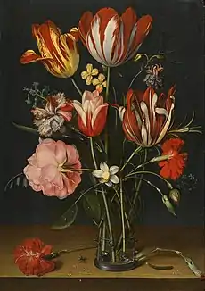 A few of his flower pieces only depict a single variety of flowers such as carnations, but most of the time he painted a mixture of a restricted number of blooms in which tulips dominate. The flowers are typically set against a dark background and are held in simple clear glass beakers with prunts in the lower register only, in order to allow the stems of each flower to be followed through to the base. His flower pieces show a greater formal elegance and refined simplicity than Brueghel's usually more elaborate flower pieces. This may possibly be due to Bosschaert's formative influence.[3]