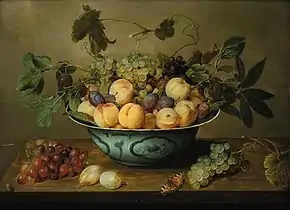 The banquet pieces of van Hulsdonck typically depict one bowl or basket of fruit in the center. There are six examples where he placed a small vase of flowers to one side of the bowl.[2] The fruits are usual freshly picked plums, grapes, apricots or strawberries, although there is an example of a painting, the Still life with raisins, apricots and plums in a porcelain dish, which depicts dried fruit and nuts.[4]