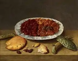 - 1 2 3 4 5 6 Fred G Meijer, Jacob van Hulsdonck, Still life on a plain table of a Wanli period dish filled with raisins, dried figs and almonds, with bread, slices of sugared preserved melon, raisins and almonds strewn on the table, with a bluebottle on the melon Archived 2016-03-04 at the Wayback Machine at Richard Green