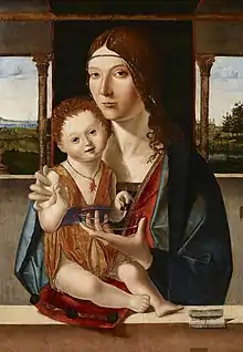 The son of the painter Antonello Da Messina, Jacobello was probably born at Messina some time before 1457, and almost certainly traveled to Venice with his father during the 1460s and 1470s. He was also active in Naples and is mentioned in his father's will of 1479. Few works are attributed to him. His only signed and dated work to survive is a Madonna and Child, dated 1480, in the Accademia Carrara at Bergamo.[1]