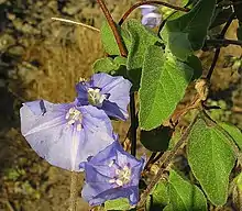 A perennial plant, this species has a woody base and may grow into a shrubby habit. The upper stems are vining, and are covered in moderately tomentose leaves. The leaves are petiolate, with the margins entire (the edges of the leaves are not serrated) and a cordate base. From September to June, the plant is in bloom. The flowers are blue to white and campanulate-rotate (shaped like a bell or a spreading like a wheel), with a very short corolla tube.[2]