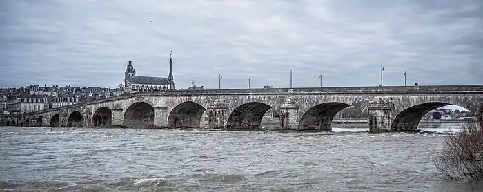 The Jacques-Gabriel Bridge (named pont Jacques-Gabriel in French) spans the Loire river in Blois, France, since the beginning of the 18th century. With a total length of 283m, it is made up of 11 arches, and is the last arch bridge on the river that is pointed. Since its construction, the edifice holds the name of the architect who designed it, Jacques Gabriel. The bridge was partially destroyed three times: in 1870 (Franco-Prussian War), 1940 and 1944 (World War II). It is now crossed by the Route Nationale 156.