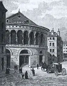 Legrand undertook public and private commissions, and also wrote as an art critic.[6] The Minister of the Interior gave Legrand the task of restoring the monuments of Paris.[6] The prefect of the department assigned him to the committee charged with supervising buildings.[7] Legrand and Molinos built the Cloth Hall in 1786, destroyed in 1855.[3] The cloth market vault was supported on terracotta tubes, and the roof was covered with copper. In its day the cloth market roof was almost as well known as the dome of the corn market.[8] Legrand and Molinos worked on developing the Paris markets, and also designed the Théâtre Feydeau in the rue de Richelieu.[2]