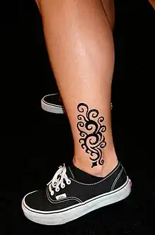 Jagua tattoo is a temporary form of skin decoration resulting from the application of an extract of the fruit Genipa americana, also known as jagua. This fruit has been used for body ornamentation and medicinal purposes in many areas of South America for centuries. It has recently been introduced in North America and Europe as an addition to henna body art, also called mehendi, mehandi, or mehndi in India. (The term "henna tattoo" is often used as a generic term for temporary tattoos.)