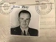 After Germany's defeat in 1945, Palij stayed in Poland. On 30 April 1948, another Piadyki-born Ukrainian camp guard, listed in Soviet military records as Nikolaj Gutsulyak or Mykola Hutsulyak, revealed to the Soviet authorities that he had served with Palij at the Trawniki extermination camp.[3] In early 1949, and not having yet been traced by the Soviets, Palij, without disclosing his wartime service as an SS-auxiliary, submitted a request to the US Displaced Persons Commission asking to be designated a "displaced person" eligible to emigrate to the United States. He provided the American authorities with a false timeline of his life during the war, claiming he had worked on his father's farm in Piadyki, and that he subsequently worked in a farm and a factory in Germany.[8]