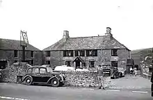 The two-storey building, constructed in the mid-18th century, had symmetrical front windows that were replaced in the 20th century. The slate roof is bitumen-coated and has hipped ends. An extension with two additional rooms was built in the 19th and 20th centuries. The central door and gabled porch are flanked by two light casements; all are attributed to the 20th century.[1] The building's exterior is made of dark slate and stone. It has a cobbled courtyard which features an old rusty anchor and a red telephone box.[19] Historically, however, the courtyard was gravel. The exterior to the Smuggler's Bar says, "Through these portals passed smugglers, wreckers, villains and murderers, but rest easy... 'twas many years ago".