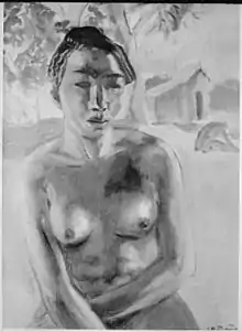 Porter was the recipient of a grant from the Rockefeller Foundation in 1945. He took a leave of absence from teaching and spent a year in Cuba from 1945 to 1946, studying art and culture in Cuba and Haiti. In Haiti, Porter's subjects included the peasant class and landscapes of the country.[6] While his work in Haiti focused on similar subjects as other Black artists who turned to Haiti for inspiration, such as William E. Scott and Aaron Douglas, his approach to the subject matter differed.[6] He did not paint his Haitian subjects as simply picturesque and created monumental figures of the "market women" he saw. Porter's paintings and writing encouraged Americans to resist the urge upon traveling to Haiti and getting lost in the picturesque quality it holds on the surface.[6] In an essay Porter wrote in 1946 for Opportunity Magazine entitled "Picturesque Haiti" he wrote, "It is altogether too easy to make the aesthetic blunder so easily made in the presence of the new and the strange, that is, to say of Haitian life or landscape, 'Oh, how picturesque!' "[6] While his paintings made in Haiti showcased the same characters as other artists at the time he surrounded this figures not with the bounty of an imagined tropical island but with urban debris.[6] The representation of economic pressures and struggles that shaped the world of the Haitians he painted separates his work from other artists inspired by Haiti before him.[6] His thorough research on Haiti, Cuba, and West Africa stimulated his creating courses at Howard in "Latin American Art" and "African Art and Architecture".[5] In 1955, he was awarded a fellowship by the Belgium-American Art Seminar and studied Flemish and Dutch Art of the 16th to the 18th century while in Belgium. With a grant from the newspaper, the Evening Star, Porter traveled to South Africa in 1963 to study West African architecture. He completed 25 paintings with South African themes during his time in the country.[7]