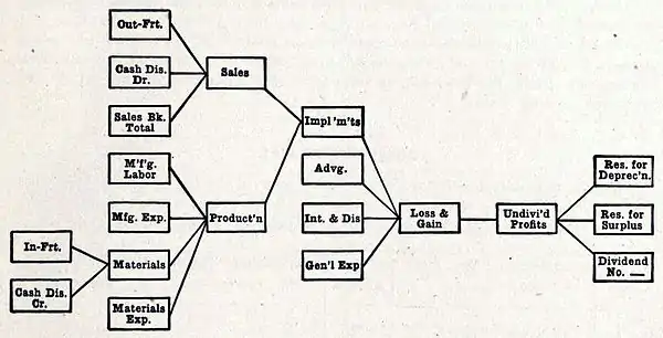 In Modern Corporation Accounting, (1908) Lyons picture some of the transactions and entries which are peculiar to corporations and corporation accounting. In doing so, he presents one of the earliest modern flow diagrams of cost accounting. These relation was originally pictured by Emile Garcke and J. M. Fells in their System of factory accounting from 1889. Lyons had simplified these relations into one single flow diagram: