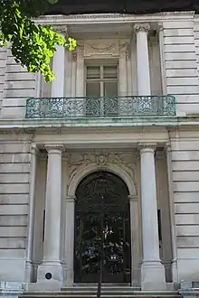 The main entrance is in the center bay on 78th Street. It contains a double-story portico flanked by vertical pilasters with quoins. The entrance is recessed within the portico and is flanked by Doric-style columns on the ground floor.[4][13] It is accessed by a short flight of steps with a balustrade that contains low relief panels. Inside the opening is a set of double doors in a round-arched opening, with stone bas-reliefs in the spandrels at the top corners. The keystone above the door has a console bracket with a relief depicting a woman's head.[13] At the second story is a balcony with an iron railing and Ionic-style columns.[4][18] There is a French window behind the balcony, topped by a carved swag and a panel with a swag and ribbons.[13] The top of the portico contains a triangular pediment supported by corbels, within which is a tympanum containing carved figures.[20]