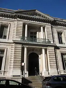 The James B. Duke House is at 1 East 78th Street in the Upper East Side neighborhood of Manhattan in New York City. It is on the northeast corner of 78th Street to the south and Fifth Avenue to the west, directly across Fifth Avenue from Central Park.[2][3] The land lot covers 13,325 square feet (1,237.9 m2) with a frontage of 82.17 feet (25.05 m) on Fifth Avenue and 150 feet (46 m) on 78th Street.[2] The house is largely rectangular in plan, except at the northeast corner, where the house protrudes slightly on the north side.[4] Nearby sites include the Payne Whitney House and the Harry F. Sinclair House to the north, the Stuyvesant Fish House to the east, and 960 Fifth Avenue to the south.[2]