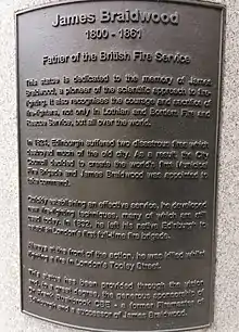 On 5 September 2008, the James Braidwood memorial statue in Parliament Square, Edinburgh was unveiled by Professor Sir Timothy O'Shea, Principal of the University of Edinburgh.[15] A fund had been established for a £75,000 memorial to Braidwood, to be created by the Glasgow sculptor, Kenneth Mackay, led by Dr Frank Rushbrook CBE, 93-year-old former Firemaster at Lothian & Borders Fire Brigade. The statue stands around the corner from the site of the original main fire station in the High Street. The bronze plaque below it reads: