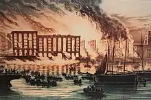 On 22 June 1861 Braidwood died in the Tooley Street fire at Cotton's Wharf near London Bridge station when a falling wall crushed him, three hours after the fire began.[7] It took two days to recover his body. His heroism led to a massive funeral on 29 June in which the funeral cortege stretched 1.5 miles (2.4 km) behind the hearse, a public spectacle almost equal to the fire itself.[8] The fire, which continued to burn for a fortnight, caused damage valued at £2,000,000, equivalent to £198,550,000 in 2021 and was considered the worst fire since the Great Fire of London in 1666.[9]