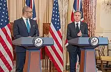 In January 2023, Cleverly again met Antony Blinken, the US Secretary of State, in Washington, DC to discuss the Russian invasion of Ukraine, recent events in Iran following the anti-regime protests occurring there among other issues, as well as to reaffirm the UK's special relationship with the United States.[50]