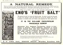 At some point he met the Newcastle physician Dennis Embleton, who often prescribed an effervescent compound of sodium bicarbonate and citric acid.[3] Mixtures of this type, combining a fruit acid with a carbonate or tartrate, were known as fruit salts, and they were marketed for a wide range of ailments, only a few of which (e.g. indigestion) they could actually ameliorate. Eno set up his own chemists shop in the Groat Market area of the city and in 1852 began selling his own fruit salt mixture.[3][5][6] Eno gave away his compound to seafarers at the port, and in this way the name Eno became associated with fruit salts around the world.[3] In 1868, he formally founded the company Eno's "Fruit Salt" Works.[3][7][8]:253