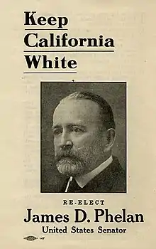 As a Democrat, Phelan ran for the U.S. Senate against Republican Joseph R. Knowland and Progressive Francis J. Heney. He was elected to the United States Senate in 1914 and served from March 4, 1915, to March 3, 1921. Although he had toned down his anti-Japanese rhetoric during World War I, when the United States had allied with Japan, in 1919, Phelan once again began to speak out against the "Yellow Peril," delivering a speech in favor of Japanese exclusion before a special session of the state legislature.[5] He was an unsuccessful candidate for reelection in 1920, defeated by Republican Samuel M. Shortridge, coming in second with 40% of the vote. His re-election campaign relied on racial fears; one of his reelection campaign posters contained the headline "Keep California White."[5] (This poster is displayed at the Japanese American National Museum). During his time in the Senate, he was chairman of the U.S. Senate Committee on Railroads during the 64th Congress and of the U.S. Senate Committee on Irrigation and Reclamation of Arid Lands during the 65th Congress.