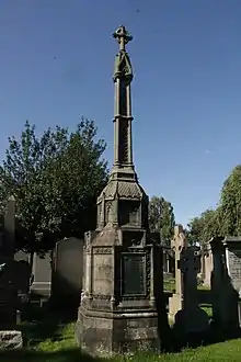 He is buried close to his home, in Dean Cemetery, Edinburgh and has an impressive marble monument of great height and ornament over his grave. He is buried with both wives, including his second wife, Jane Gibbs, Lady Falshaw (d.1889). The grave lies on the main east-west path of the northern extension to the original cemetery.