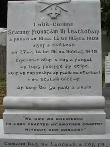 James Fintan Lalor (in Irish, Séamas Fionntán Ó Leathlobhair) (10 March 1809 – 27 December 1849) was an Irish revolutionary, journalist, and “one of the most powerful writers of his day.” [1] A leading member of the Irish Confederation (Young Ireland), he was to play an active part in both the Rebellion in July 1848 and the attempted Rising in September of that same year. Lalor's writings were to exert a seminal influence on later Irish leaders such as Michael Davitt, James Connolly, Pádraig Pearse, and Arthur Griffith.[2]