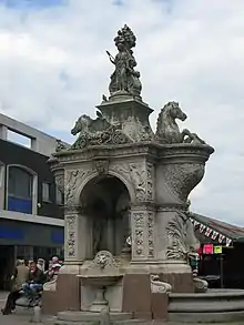 A grade II structure designed by James Forsyth in 1867 and presented to the town of Dudley by the 1st Earl of Dudley. A triumphal arch ornamented with sculpture in the Flamboyant Italian Renaissance style, including heraldic dolphins and heraldic demi-sea horses, topped with female figure below a large cornucopia.[6]