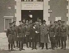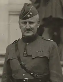 When the United States entered World War I in April 1917, Harbord was attending the United States Army War College.[12] He was selected by Pershing, now a major general appointed to command the American Expeditionary Forces (AEF), to be his chief of staff.[13] Harbord graduated in early May,[14] and on 28 May set sail for England with Pershing and his headquarters staff.[15][16][17] Over the next few months Harbord worked closely with Pershing to organize the AEF's buildup on France's Western Front, including the shipping schedules of American forces being sent to Europe, and he was promoted to temporary brigadier general in August 1917.[14][18]