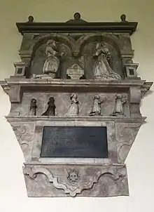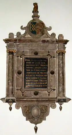 Holy Cross Church in Milton Malsor contains a monument on the south wall of the chancel to Harrington's mother, Dame Jane Harrington.[2] According to the memorial, she died on 30 March 1619, when James was 7 or 8 years old. The memorial reads, in modern English but punctuated as in the original: