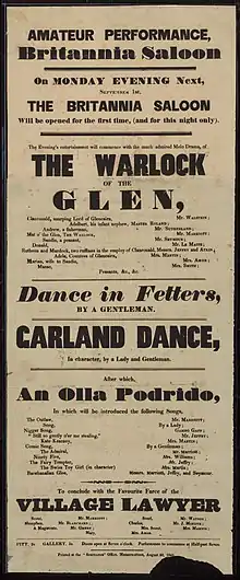 On 11 July 1848 at the Britannia Saloon, Marriott's company premiered his play, Marcilina. According to the Dictionary of New Zealand Biography, this is believed to have been the first performance of a play written by a New Zealander.[3]