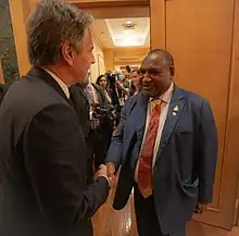 James Marape (born 24 April 1971) is a Papua New Guinean politician who has served as the prime minister of Papua New Guinea since May 2019. He has been a member of the National Parliament of Papua New Guinea since July 2007, representing the electorate of Tari-Pori Open in Hela Province in the highlands. He has held Cabinet Posts as Minister of Education (2008–2011), Minister of Finance (2012–2019), and Minister of Foreign Affairs (2023–present).[1][2] Marape entered the 2022 elections under the banner of Pangu Party and won more seats than any other party. He was therefore entitled to form the government. His new government was elected unopposed by the new parliament.[3]