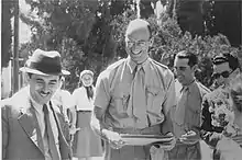In April 1941, his father sent him on a secret, world-circling diplomatic mission to assure numerous governments that the United States would soon be in the war. The leaders contacted included Chiang Kai-shek in China, King Farouk in Egypt, and King George of Greece. During this trip, Roosevelt came under German air attack in both Crete and Iraq. In the African/Middle Eastern portions of the mission, he traveled with Britain's Lord Mountbatten as far as Bathurst in the Gambia. They reported on trans-African air ferry conditions, an important concern of FDR and Winston Churchill at the time.[11][12] In August, Roosevelt joined the staff of William J. Donovan, coordinator of information, with the job of working out the exchange of information with other agencies.[2]