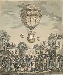 In May of the following year he took off near Moulsey Hurst, Surrey, accompanied by W. Wyndham MP, hoping to reach France, but in fact descending in the Thames Estuary, and thus failing to repeat the earlier exploit of Jean-Pierre Blanchard and his passenger.[4] Sadler made two further ascents in May 1785, the first of which was from a field behind a gentleman's garden on the site of what is now Balloon Street in Manchester. On this flight he was accompanied by a cat and landed in Radcliffe.[5] On his second ascent he travelled alone and, having risen to 13,000 feet (4,000 m), travelled 50 miles (80 km) before landing near Pontefract, West Yorkshire. On this occasion, he sustained bad injuries after being dragged for around two miles (3 km) by the balloon, which eventually threw him clear before taking off again empty.