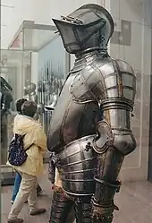 Sir James Scudamore left behind some of the finest surviving suits of armour from Elizabethan England, built at the royal Greenwich armoury. His tournament armour features a distinctive armet of the Greenwich style with a high visor and a raised crest; articulated tassets and cuisses, and cris-crossing strips of blued steel inlaid with elaborate gold designs. Another armour, in the later cuirassier style, features a burgonet with a falling-buffe visor and detailed gilding and etching. It is in this armour that he is shown in his portrait which now hangs at Holme Lacy. It is obvious from the painting that the armour was originally coloured a dark shade, and had been polished down to bare steel during its restoration. The pattern for this armour is identical to several others in the Jacob Album including William Compton, 1st Earl of Northampton. A portrait of Compton shows him wearing an armour of more or less identical appearance.