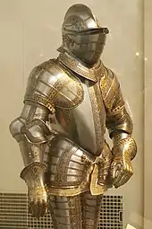 Scudamore's suits of armour were discovered in 1911 packed away in a chest in the attic of an abandoned tower at Holme Lacy, in an extreme state of disrepair and significantly damaged by rust. They had been sitting in a chest beneath an eave through which water had been trickling down into a pool on the floor; they had likely been in this sorry condition for several hundred years. The owner of the estate at the time, Lord Chesterfield, put the armour up at auction for the sum of twenty pounds. A dealer who happened to notice it at the auction informed Chesterfield that it was worth far more, and purchased it for the sum of two thousand pounds. Later, Chesterfield happened by chance upon that dealer's shop, and saw the same armour for sale – for fifteen thousand pounds. Chesterfield sued the dealer and the armour was returned to him.[12] The suits of armour were subsequently purchased by J. Pierpont Morgan and given to the Metropolitan Museum of Art in New York City, where they underwent extensive restoration and had those pieces that were missing altogether replaced with replicas made by Daniel Tachaux. They remain on display today.[12]