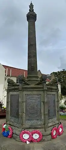 Richardson's architectural practise resumed in 1919, and the next year John Ross McKay, became a partner. McKay had studied at the School of Applied Art at the same time as Richardson, and had also worked in Lorimer's office.[4] Richardson's position as Inspector of Ancient Monuments became full-time in 1920, and in 1922 he became a part-time lecturer in the Edinburgh College of Art, which had assimilated the School of Applied Art. This left him little time for architectural work, and while Richardson remained a partner, and was able to attract clients through his official position, McKay did most of the practical work.[1] Post-war work by the practice included the North Berwick War Memorial (1920)[5]: 365 and the restoration of a fountain in Linlithgow Palace [5]: 297 .