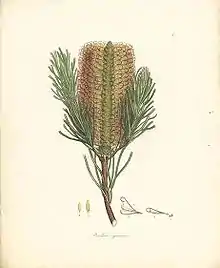 - A Specimen of the Botany of New Holland Written by James Edward Smith and illustrated by James Sowerby, it was published by Sowerby between 1793 and 1795, becoming the first monograph on the Flora of Australia. It was prefaced with the intention of meeting the general interest in, and propagation of, the flowering species of the new antipodean colonies, while also containing a Latin and botanical description of the sample. Sowerby's own hand-coloured engravings, based upon original sketches and specimens brought to England, were both descriptive and striking in depiction.