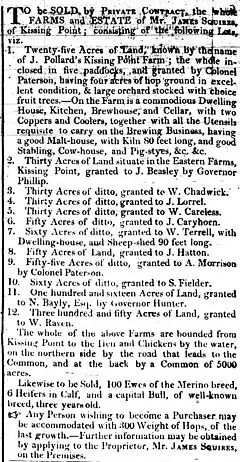 Deaths: – On Thursday evening last, at Kissing Point, after an illness of about 3 months, Mr James Squire, in his 68th year. As one of the primary inhabitants of the Colony, having come hither in the first fleet in 1788, none ever more exerted himself for the benefits of the inhabitants than the deceased. He was the first that brought Hops to any perfection and hence was enabled to brew beer of an excellent quality. "Squire's Beer" was well known. He might for long residence, be styled the Patriarch of Kissing Point; as he had lived, where he died, 26 years. The "OLD HANDS",[lower-alpha 3] by the frequent visitation of death, are becoming thinned in their ranks; this should lead to reflection, for the day will soon arrive when even those, now living, shall cease to say, "I came in the first fleet."[31]