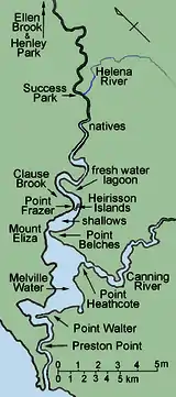 On 12 March the boats reached a place where a tributary, later named Helena River, joined the Swan from the east. The party also found another fresh water stream, which they named Success, on the west side of the Swan. From this point on, the Swan narrowed and there were many obstructions. The next day, the cutter was holed and had to be repaired, after which the party reached a creek which Stirling named Ellen Brook, after his young wife. The Swan was not navigable any further and Stirling and Garling set off on foot for the hills to the east, arriving at about sunset. On their return to camp they lost their way in the dark, but Frazer sent out search parties to guide them back.[40] On 14 March the party split into three groups. Frazer went east and Belches and Heathcote north. Stirling and Clause went west and discovered a freshwater lagoon, some Aboriginal huts and a fertile region which so pleased Stirling that he named it Henley Park after his Surrey home.