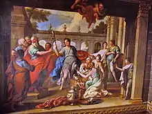 Thornhill's vast murals in great houses often related to topical events, as seen through the eyes of his mainly Whig patrons. At Chatsworth, during 1707-8, Thornhill painted a number of walls and ceilings, the most notable being the continuous wall and ceiling painting of the Sabine room, then a lobby, but since used as a bedroom. Here he painted The Rape of the Sabine Women, a vast panorama of mounted warriors carrying off the Sabine women to Rome. He chooses to feature strongly Hersilia, who was deified for her loyalty to her Roman husband, Romulus, as against her Sabine family - a deliberate reference to Mary, lauded by the Whigs for supporting her Protestant husband, William, against her Catholic father, James.