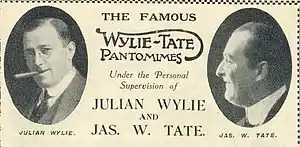 Wylie and Tate concentrated on pantomime after World War I, introducing shows such as Any Lady (1918), The Follies of 1919 (which was repeated in each subsequent year) and Mr Manhattan (1919), The Whirl Of Today (1920), Aladdin (1920), and many shows at the London Hippodrome, including The Peep Show (1921), 1921 Swindells Stores, Round In Fifty (1922, with Herman Finck, based on Around the World in 80 Days), Brighter London (1923) and Better Days (1925).